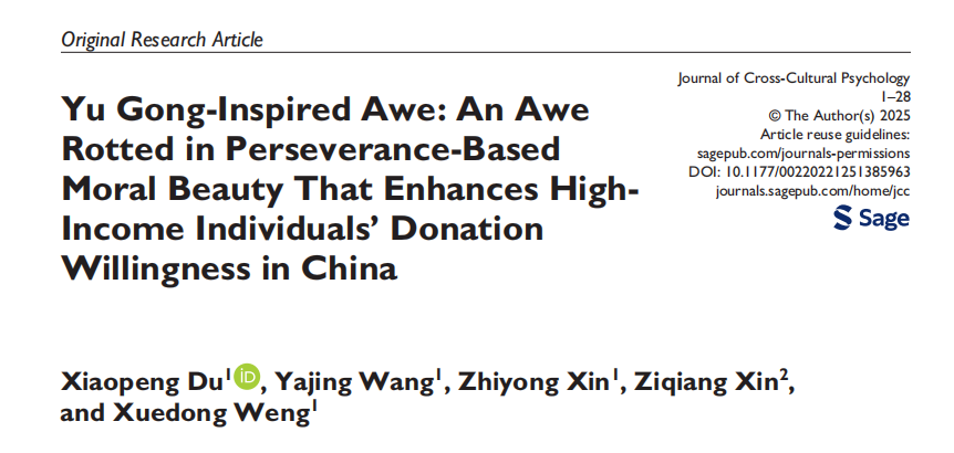 近日,437bwin必赢国际心理学系辛志勇教授和杜晓鹏助理教授团队在跨文化心理学国际期刊《Journal of Cross-Cultural Psychology》发表研究成果,提出并系统阐释了一种植根于中国文化、并具有现实性和潜在文化普适性的敬畏类型——“愚公式精神敬畏”。该研究发现,这种由普通人坚忍不拔的精神力量所激发的敬畏体验,不仅能够提升高收入群体的慈善捐赠意愿,也有助于弱化对贫困群体的负面刻板印象,为理解促进公益行为和改善社会认知提供了新的视角。《Journal of Cross-Cultural Psychology》为我校AA类期刊,近5年综合影响因子为3.3。作为跨文化心理学领域的旗舰期刊,该刊创刊至今已有50年,为研究文化与行为关系的学者提供了重要的跨学科交流平台,是全球跨文化研究的重要知识来源和学术纽带。论文在线链接:https://journals.sagepub.com/doi/10.1177/00220221251385963。
